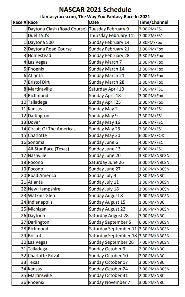 Jun 15 2018 - Print Nascar Xfinity Series Racing Schedule. 45 rows 2021 NASCAR Cup Series Schedule. Race Race Date TimeChannel Daytona Clash Road Course Tuesday February 9 700 PMFS1 Duel 150s Thursday February 11 700 PMFS1 1 Daytona 500 Sunday February 14 230PMFox.